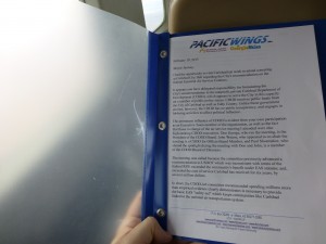 Each seat was also equipped with a copy of open letters between Pacific Wings and the City of Carlsbad arguing about the EAS contracts. Small town politics at work.